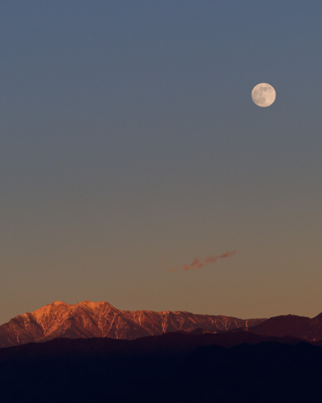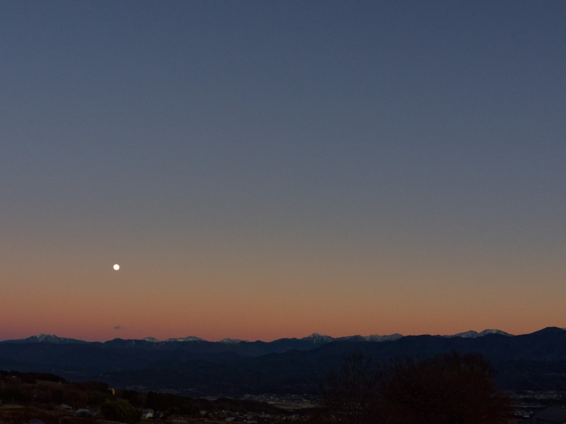 12月は4日でした。午後4時頃、仙丈ケ岳の少し右から十四夜の月が昇ります。冠雪した3,000m級の山並みと月、1つめの見どころです。この段階は、冬でもまだ明るい時間に、こそっと現れる感じなので、断しているとまぁまぁ見逃します。