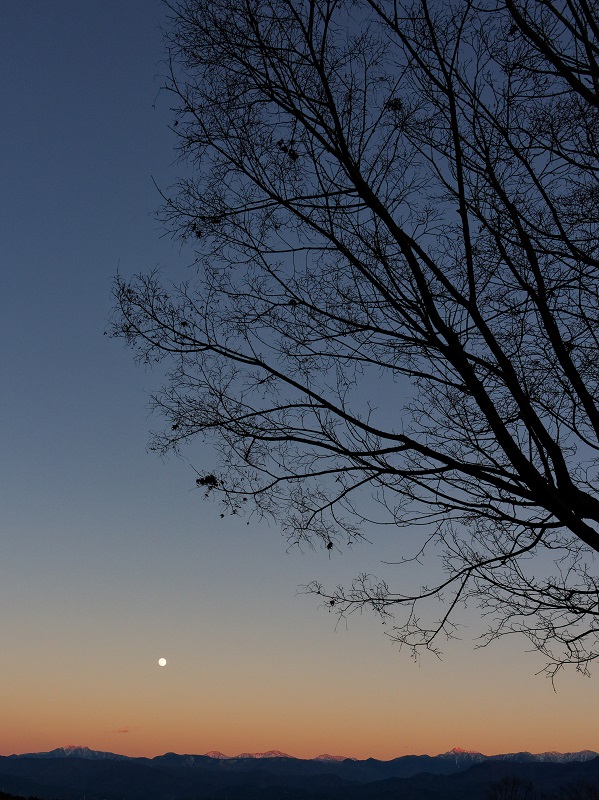 2つ目の見どころは午後4時30分頃、空は青いながらも少し暗くなって、月が映えます。前山は暗くなり、南アルプスはオレンジ色に染まってきます。