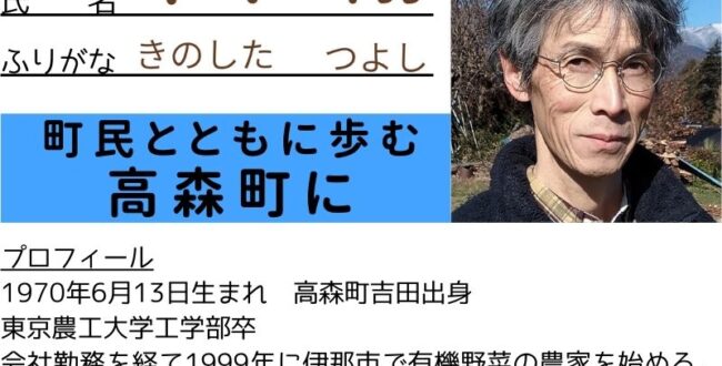 「町民とともに歩む高森町に」高森町長選挙立候補予定者 木下さんのマニフェスト