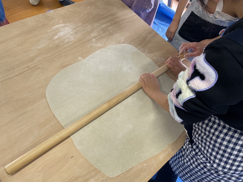 お母さん達も追いついて、そば切りの工程にはいります。
