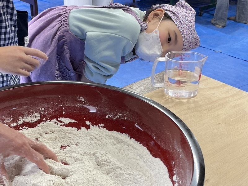 愛好会のみなさんに手取り足取り教えてもらえる子どもたちの蕎麦は順調に生地が出来上がりますが、ややほったらかし気味のお母さんたちはなかなかまとまらない蕎麦粉に悪戦苦闘。