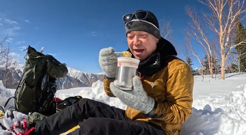 山頂で昼食をとる麦峰さん。雪山でカップヌードルはさぞかし美味しいことでしょう。表情が全てを物語っています。しかもプラスチックのフォークで、一番おいしい食べ方。